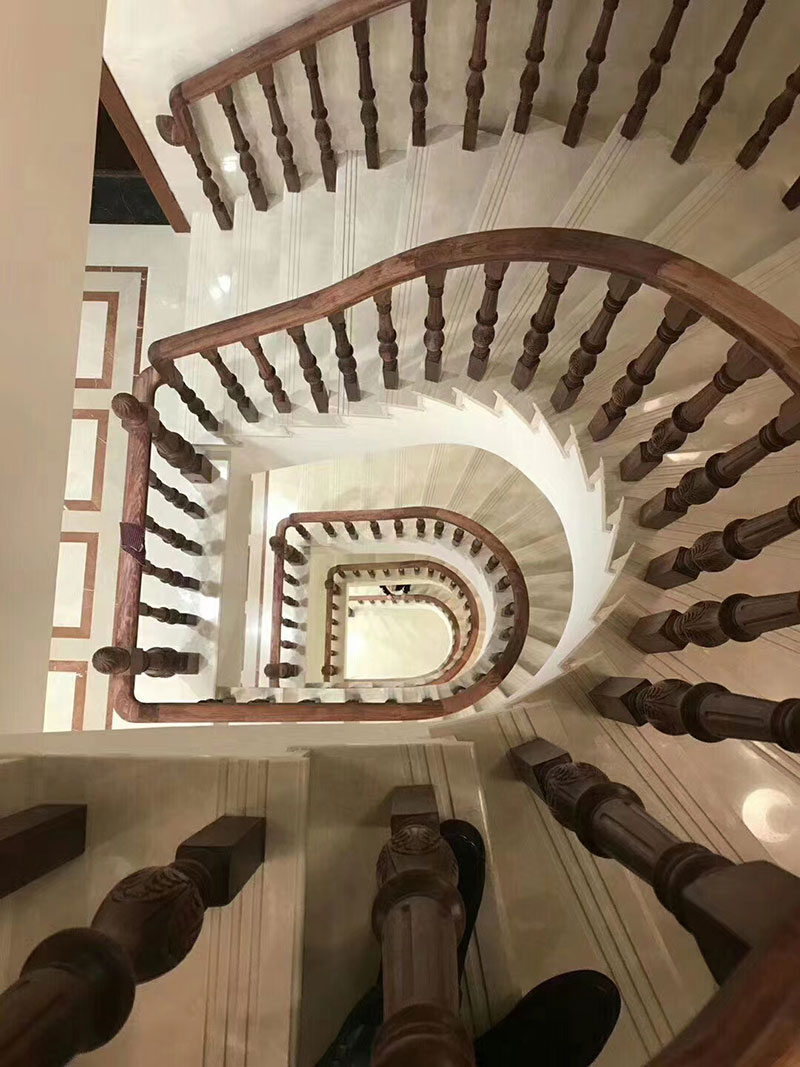 業主的旋轉樓梯采用鋼結構的主框架,螺旋向上,然后鋪設石材,安裝燈帶和玻璃護欄。完成效果從樓上到樓下都很好,可以提高整個房子的先進感。接下來,讓我們來看看旋轉樓梯的細節: